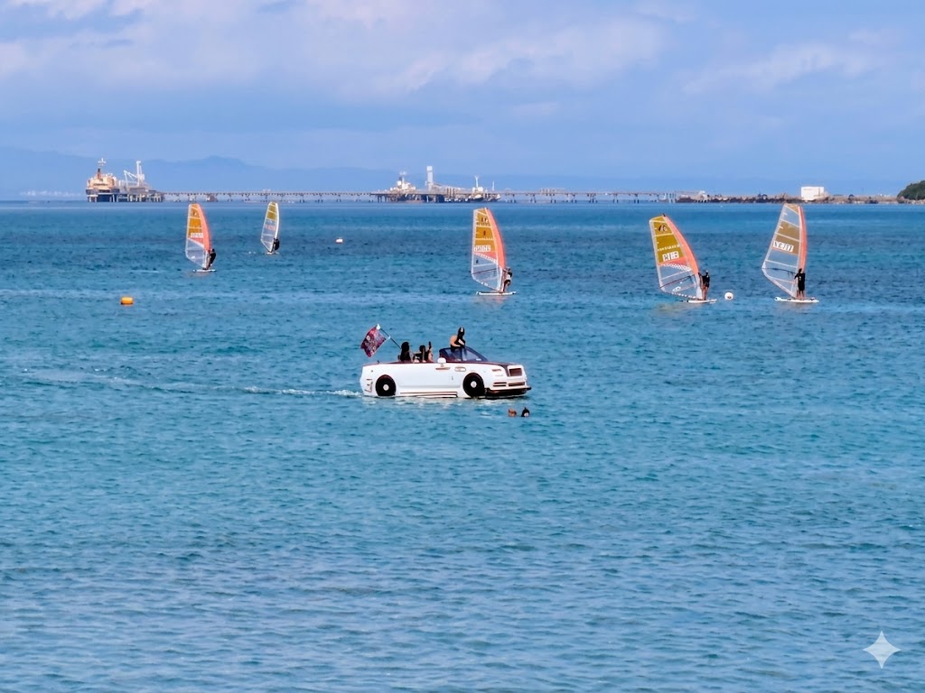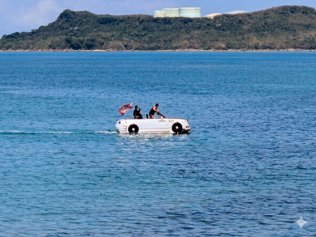 よく見ると、なんと車型のジェットスキー! 猛スピードで海面を爆走する姿は、まさに映画の世界。二度見、三度見してしまいました(笑)。